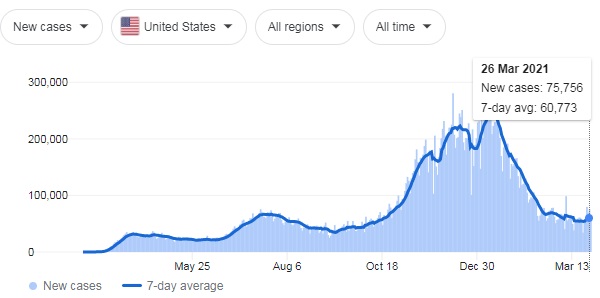 미국의 7일간의 평균 확진자 수를 보면 2월 27일에 68,479명, 3월 5일에 61,128명, 3월 12일에 62,384명, 3월 19일에 54,248명, 3월 26일 60,773명으로 조금씩 줄어들고 있습니다. 숫자 하나하나는 많아 보이지만 미국의 인구수를 생각해보면 엄청나게 많다고는 할 수 없으며 역시 중요한 점은 확진자 수가 줄고 있다는 것입니다.