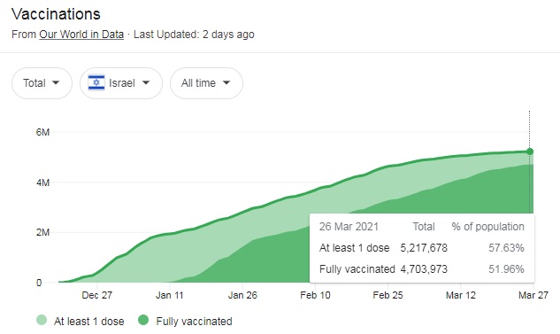 이스라엘엔 전 세계에서 코로나19 백신 접종률이 가장 높은 나라입니다. 전 국민의 57%가 1차 접종을 마쳤고, 전체 인구의 반이 넘는 52%가 접종을 완전히 끝냈습니다. 그럼에도 얼마 전까지 이스라엘의 코로나19 감염자가 오히려 늘고 있다는 기사가 나오기도 했습니다만, 코로나 백신 효과가 나타나기까지, 즉 완전히 항체가 형성되기 까지 시간이 조금 걸리는 것을 감안한다면 지금쯤 그 효과를 판단해 볼 수 있지 않을까 싶습니다.