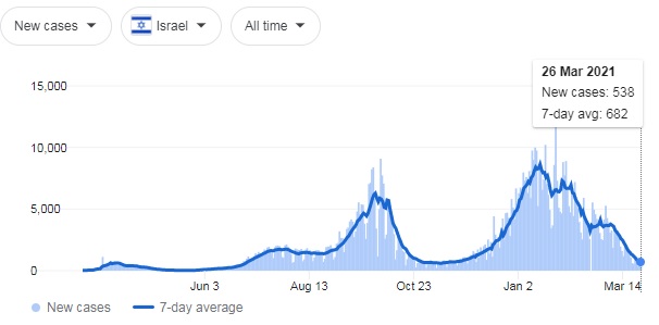 1주일 단위로 이스라엘의 7일간의 평균 확진자 수를 보면 2월 27일에 4117명, 3월 5일에 3,669명, 3월 12일에 2,819명, 3월 19일에 1,487명, 3월 26일 682명으로 엄청난 속도로 확진자 수가 줄고 있는 것을 알 수 있습니다.